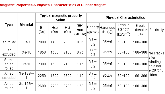 المغناطيس المطاط : مطاط مغنطيسات دائمة المغناطيس الذي بخلطة المطاط الصناعي ferrite مع السلطة ، ثم العجن وتجهيز extrusion molding. المطاط المغناطيس المواد بكلفه اقل من غيرها من المواد المغناطيس. مرونتها وقدرتها الآلة تجعل تصميم الابتكارات وتقنيات التصنيع الآلي ممكن. ويستخدم على نطاق واسع في الحاسوب ، وثلاجه وجهاز فاكس وطابعة ليزر وتكرار ماكليني الجزءيه الحركيه وتعقيم الادوات في خزانة غرفة لعب الأطفال والقرطاسيه والرعايه الصحية المادة.